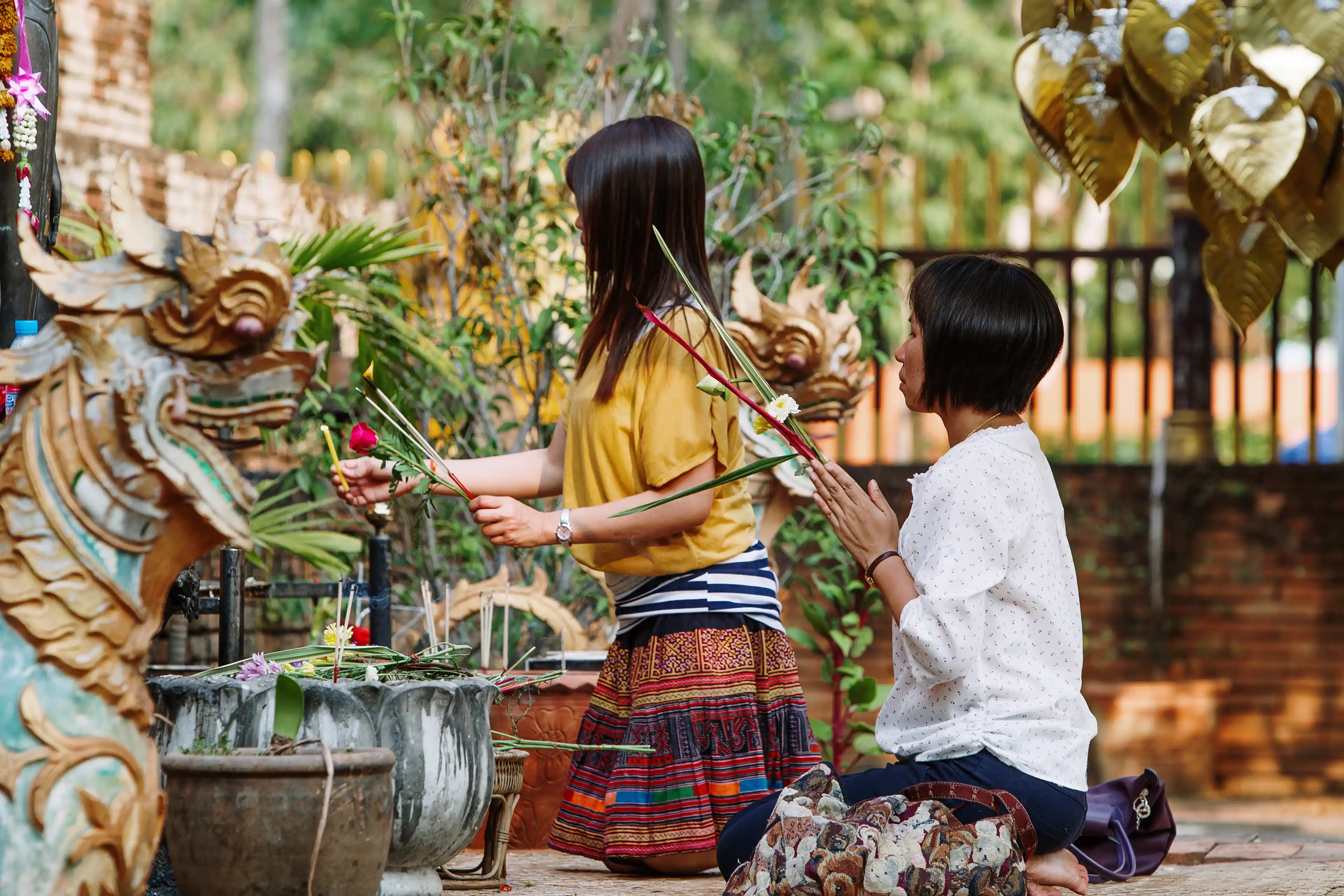 When praying to a Buddha statue at a temple, many people give a small donation to receive a gold leaf square. The gold leaf is then pressed onto the Buddha statue as a way to make merit. Over time, many Buddha statues, often made of bronze, become covered in shimmering gold leaf from thousands of temple visitors.
