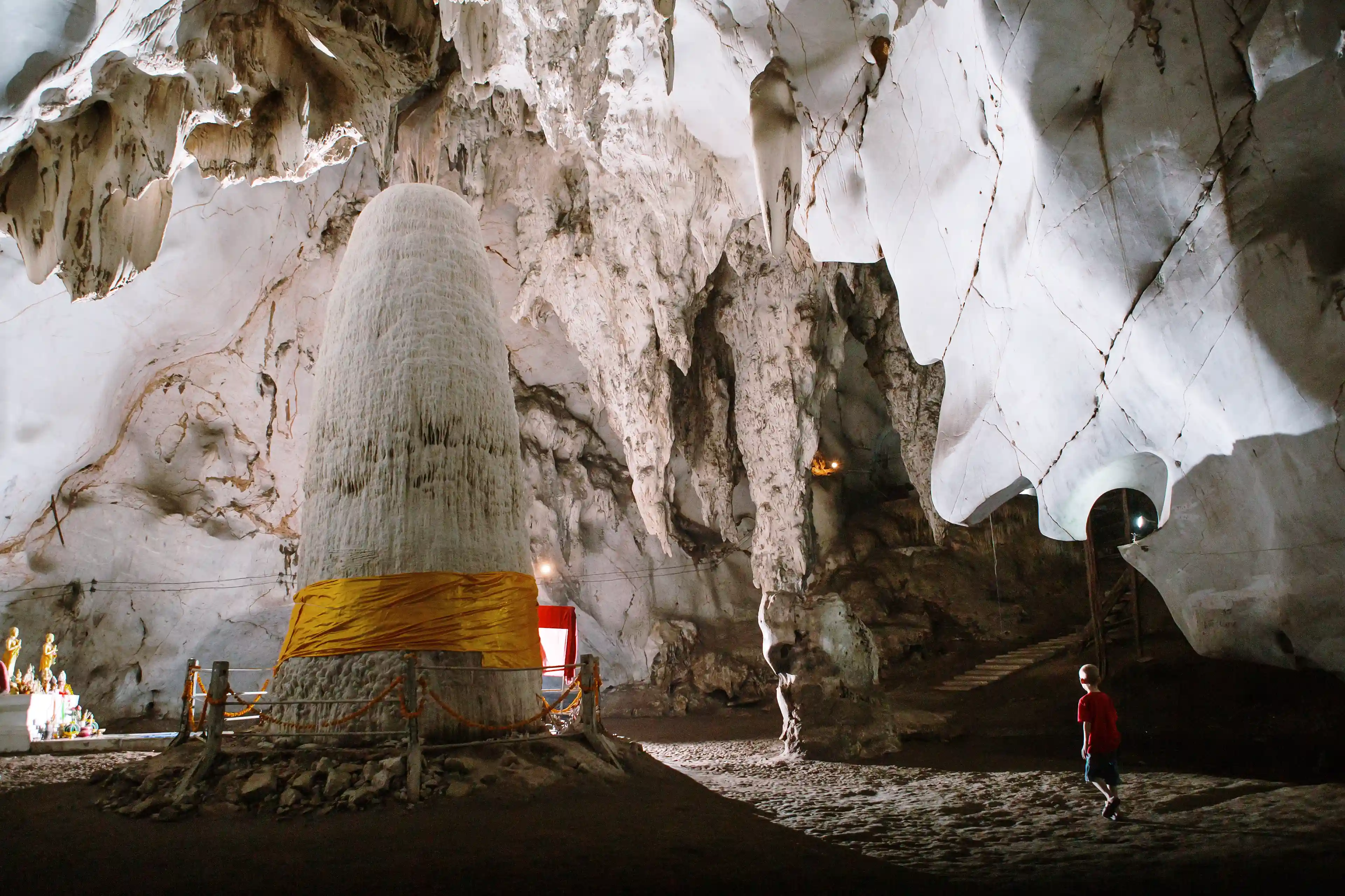 We spent many weekend afternoons exploring local caves. Some of the formations we witnessed are truly incredible. Just look at the size of this one! The gold cloth wrapped around its base is an indication that it’s a sacred feature of the cave. Though predominantly Buddhist, the belief system here incorporates animistic elements: beliefs that inanimate objects and natural phenomena can be inhabited by supernatural power and spirits. We would often see people making offerings to appease the spirits in such places.